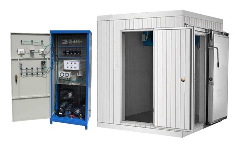 實(shí)訓(xùn)裝置主要由控制柜、水冷制冷機(jī)組、高溫拼裝式冷庫(kù),低溫拼裝式冷庫(kù)、主機(jī)實(shí)訓(xùn)模塊、連軸式冷卻水泵,冷卻塔,溫度和壓力傳感器等組成。