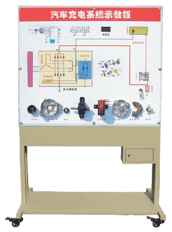 示教板上半部分為發(fā)電機的分解零部件,下半部分為實物總成;蓄電池、點火開關(guān)、電源總開關(guān)、彩色原理與結(jié)構(gòu)圖、故障設(shè)置系統(tǒng)、交流電動機及使用說明書及任務(wù)驅(qū)動式實訓指導書等。